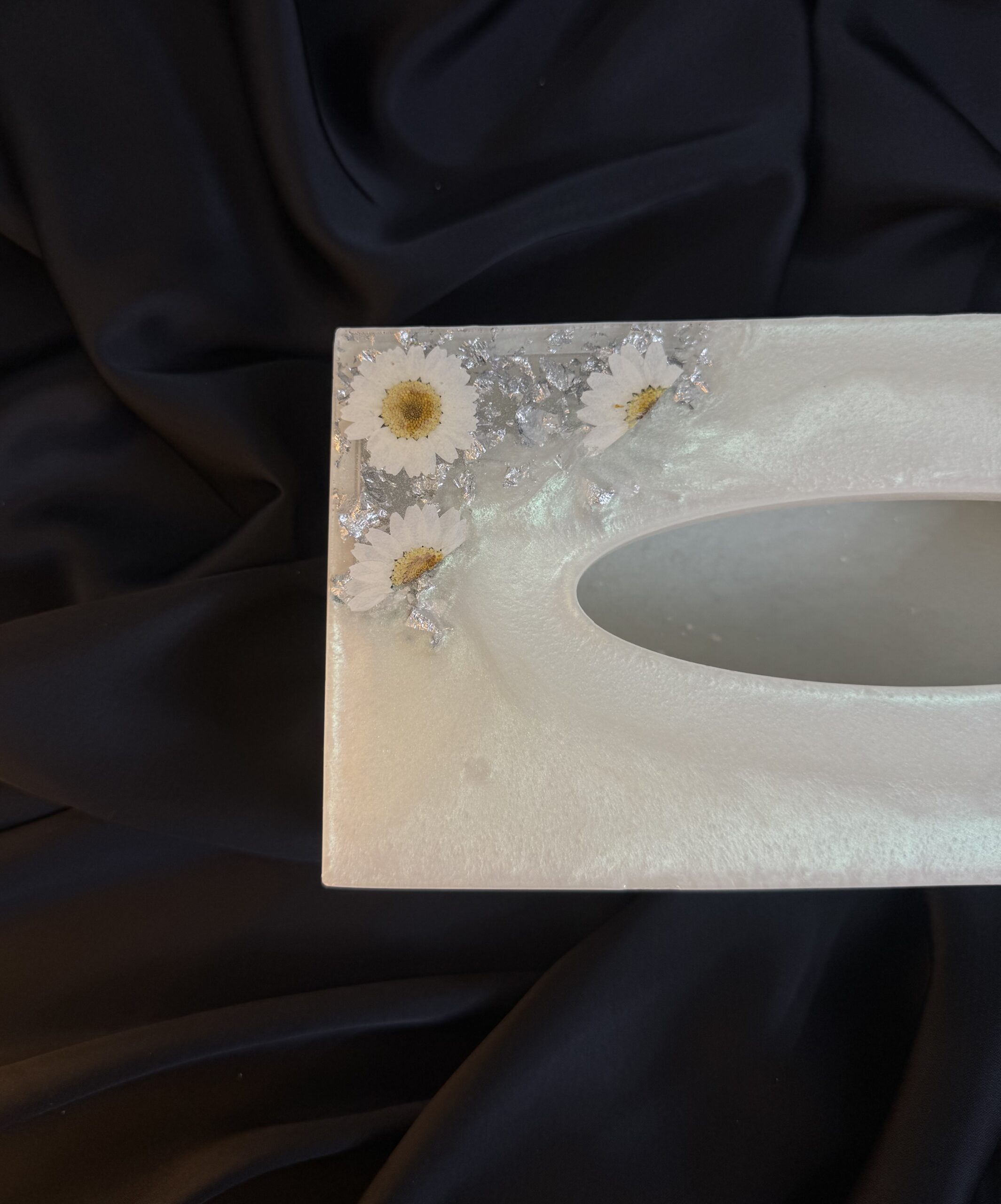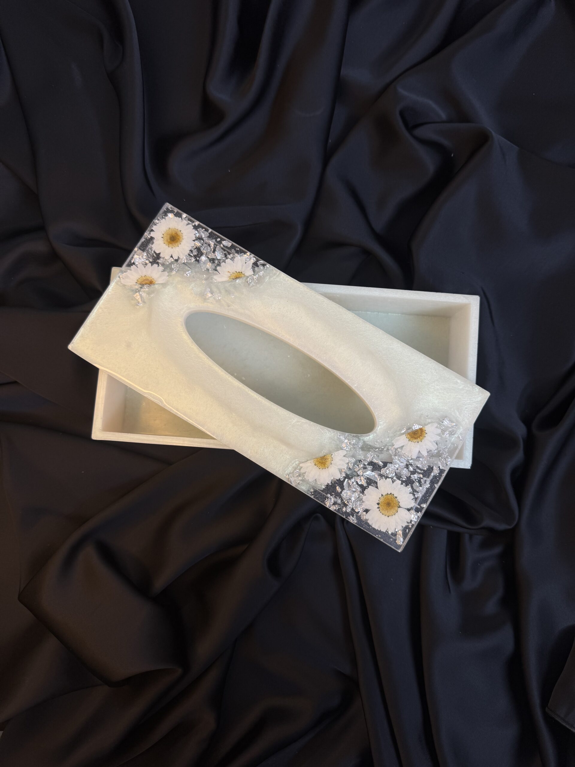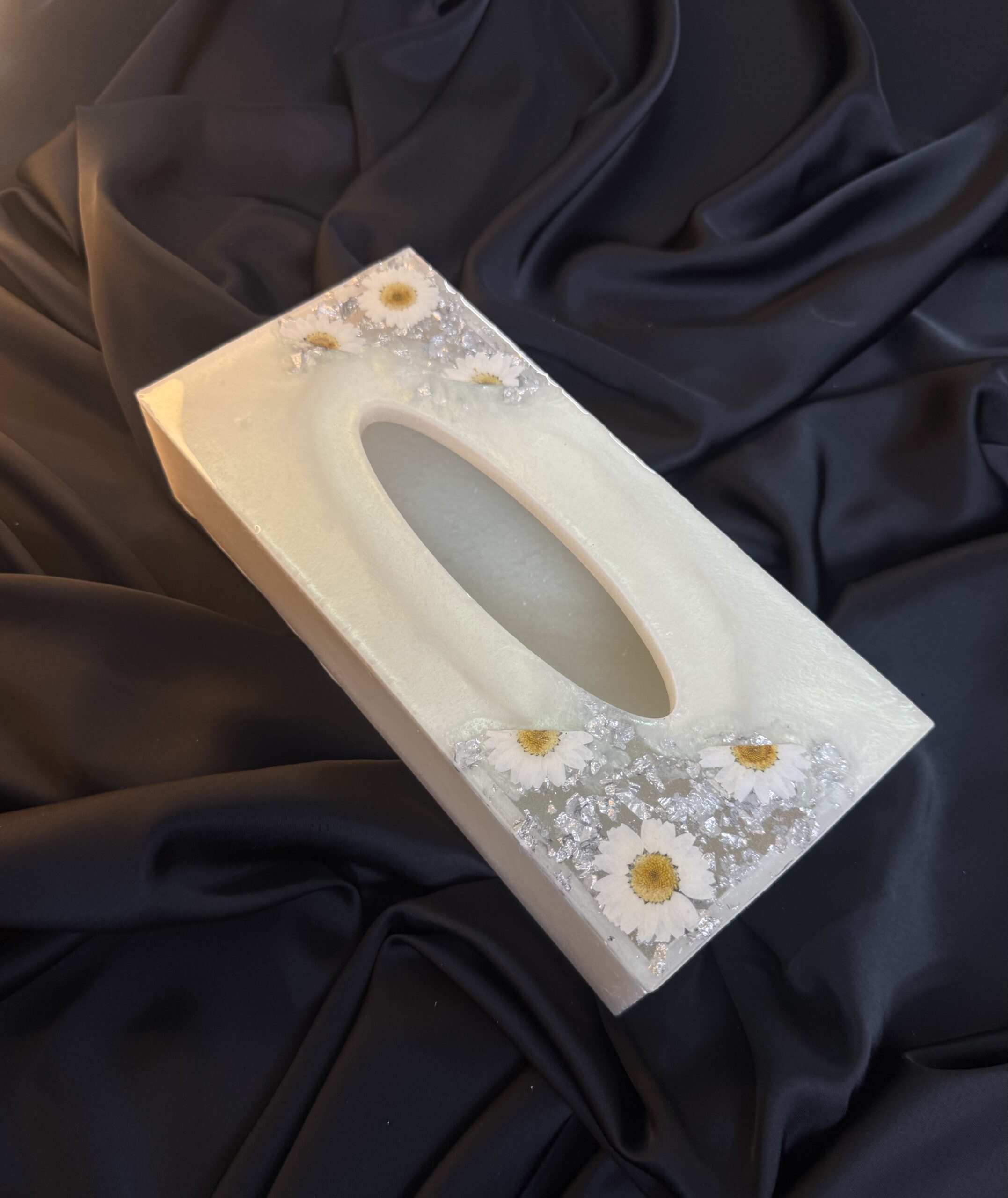 Step into a world of subtle shimmer and floral charm with our Gleaming Daisy Resin Tissue Box. Handcrafted with love and care. Explore our new resin art ideas in Pakistan. Imagine the soft, ethereal glow emanating from the pearlescent white resin, creating a truly captivating base. Embedded within this luminous canvas are delicate white daisy flowers. Tiny, iridescent pearls are nestled amongst the blooms, catching the light with a gentle, sophisticated sparkle. Glimmering golden flakes are scattered throughout, adding a hint of opulent texture and visual interest. Treat yourself or surprise someone special with this unique blend of floral elegance and shimmering sophistication.