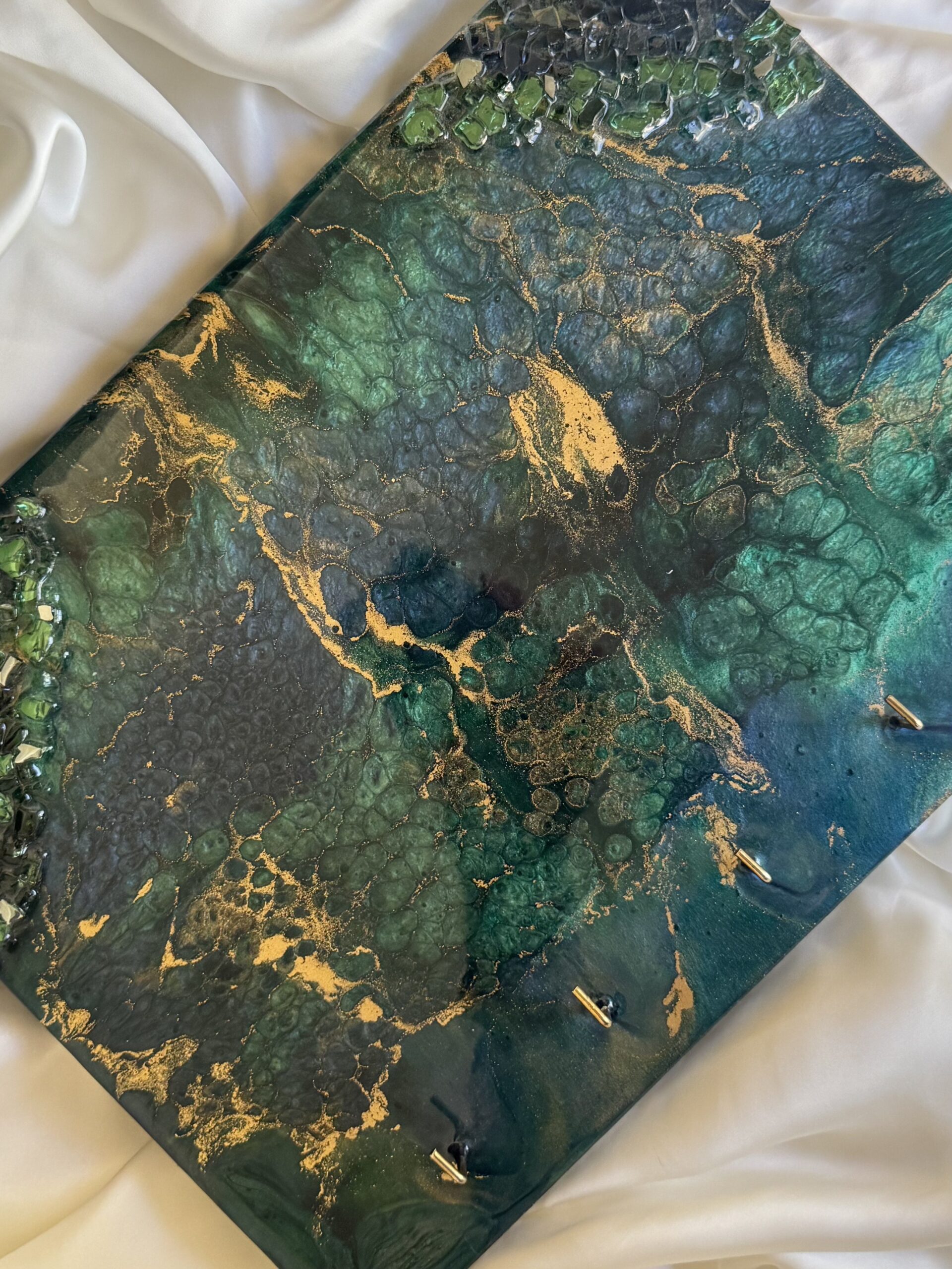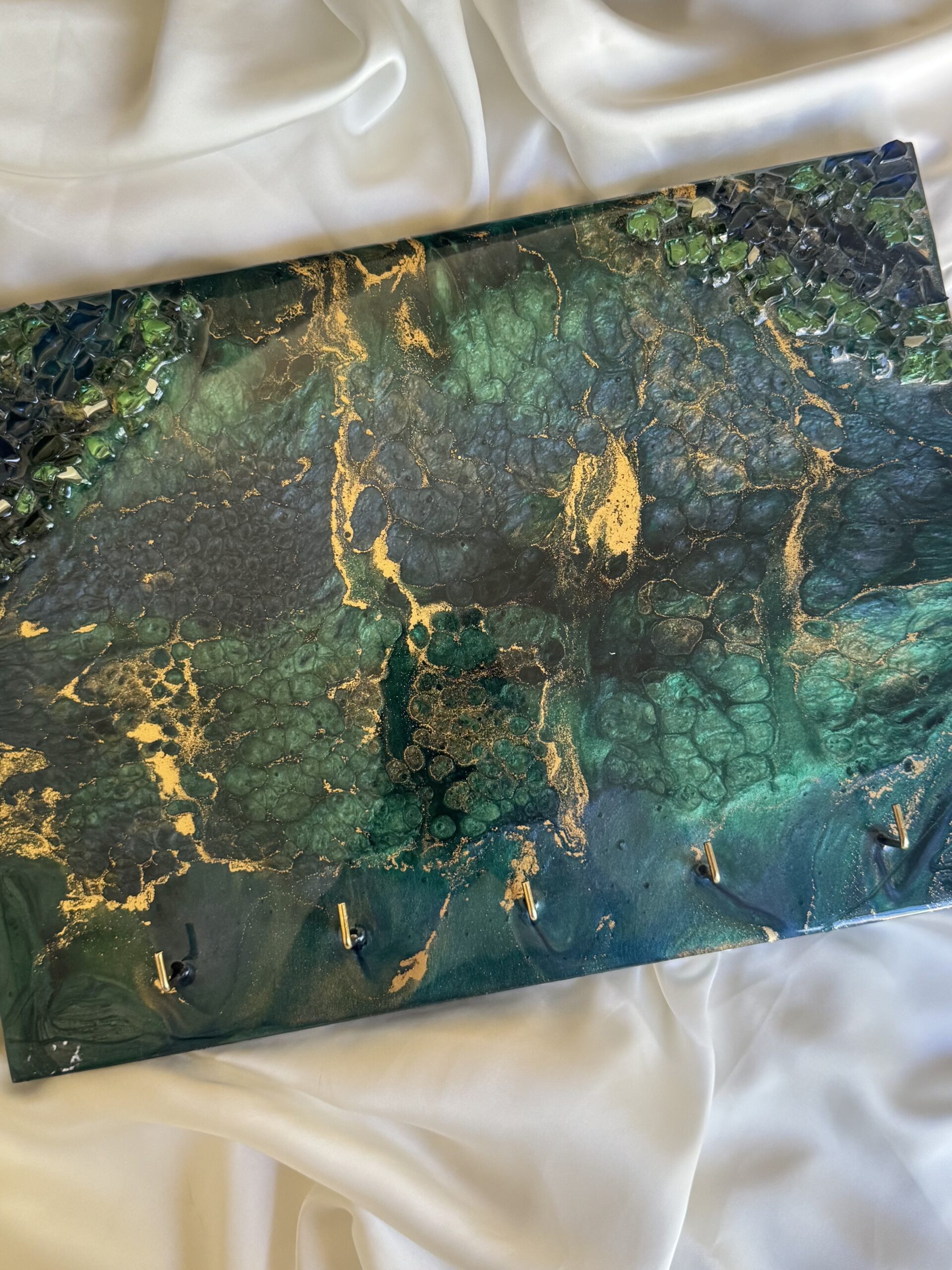 Keep your keys handy and elevate your decor with this eye-catching Peacock Swirl Resin Key Stand. The mesmerizing green and gold design makes it a functional piece of art for your home. A unique handmade key holder with beautiful green and gold swirls. Perfect for organizing keys and adding an artistic touch to your home decor. This aesthetic key holder adds an artistic touch to your entryway. Keep your keys accessible and beautifully displayed.