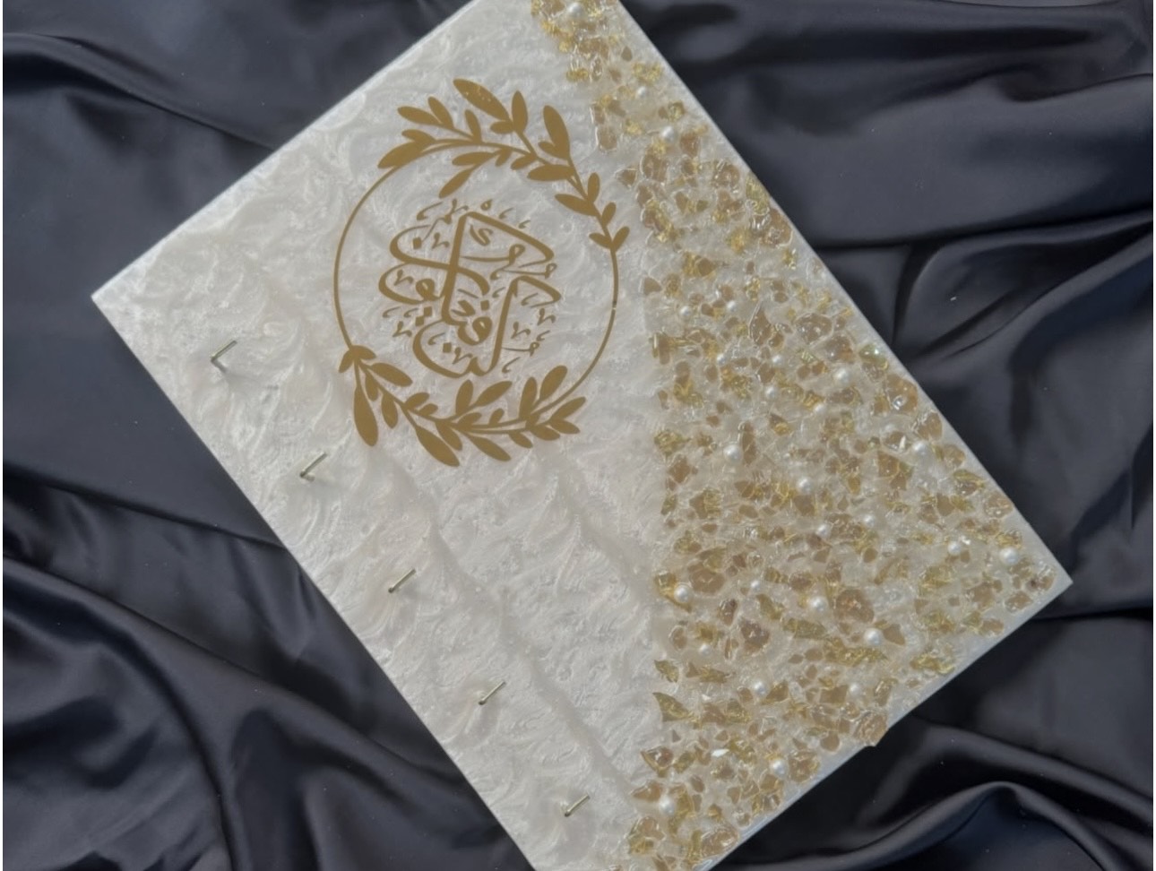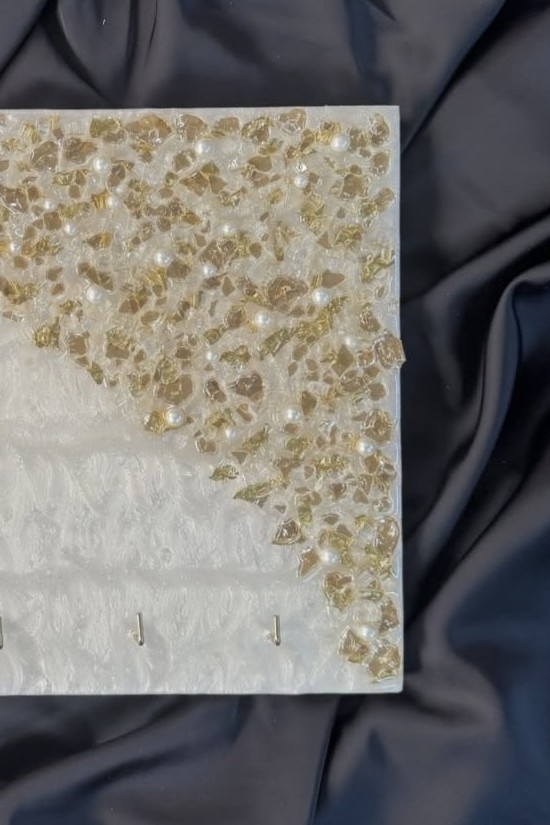 Elevate your entryway with our Pearlish Gold Resin Key Stand. It is a fusion of art and function of handmade luxury, featuring a pearlescent white base, shimmering gold flakes, delicate pearls, and a beautiful Arabic calligraphy design. This custom resin key stand, with its pearlescent finish and stunning gold details, is designed to bring a little serenity to your space. It’s more than just a key holder—it’s a statement piece.